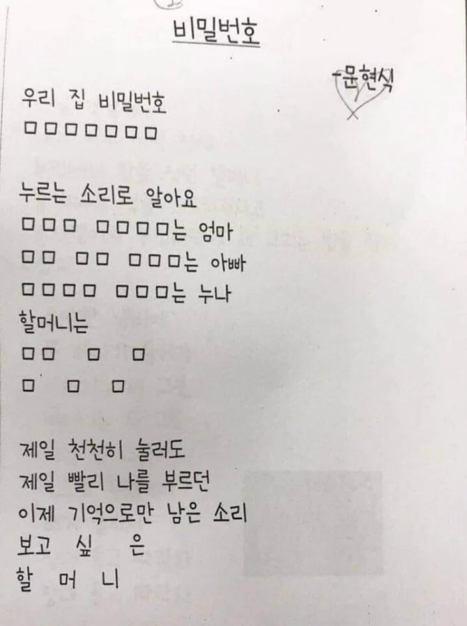 비밀번호. 한 때 인터넷 커뮤니티에 '천재 초등학생 시인이 쓴 시'로 알려진 시이다. 비밀번호 누르는 소리로 누르는 사람을 특정하고 할머니에 대한 그리움을 담은 시로 아이들의 눈과 마음을 동시에 담아 많은 사람들에게 회자되었다. 사실 시를 쓴 사람은 초등학생이 아니라 초등학교 교사이자 아동동화작가이자 동시작가인 문현식 씨이다. 사실 이 시는 2013년에 문학잡지에 발표했고, 2015년 동시집 '팝콘 교실'에도 실었는데 2019년 즈음부터 사람들에게 알려졌다고 한다.