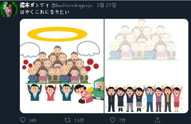 실제로 이번 코로나 19 확산때 중증 환자를 치료할 여력이 부족해지자 일본에서 "노인은 젊은이에게 치료를 양보하자" 라는 카드가 나오기도 했다. 또한 일본 트위터에는 젊은 사람들이 나이가 어린 사람들의 수십 명의 노인들을 떠받치며 힘겨워하다 노인들이 사라지자 두 손을 치켜들며 기뻐하는 모습의 일러스트가 공개되었는데 순식간에 1만 5천여 건 이상 재공유됐으며, 7만 건 이상의 '좋아요'를 받은 적도 있다. 항간에서는 일본 정부가 고령 노인들에 대한 연금 및 사회비용을 이 기회에 덜기 위해 코로나 19 고령 감염자들을 의도적으로 방치했다는 주장도 나오기도 했다.300x250'부연설명 - 정보와 상식' 카테고리의 다른 글