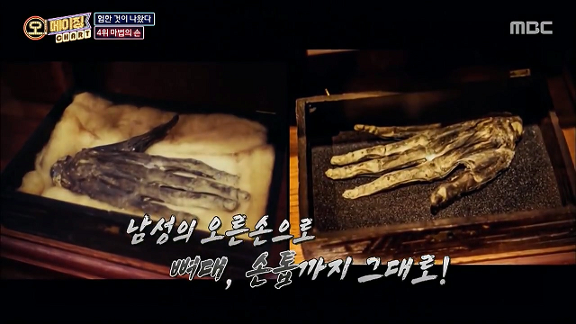 영광의 손. 사형수의 손을 잘라 피를 빼낸 후 보존제에 절여 처리한 미라 손, 혹은 미라 손을 이용한 촛대. 주로 범죄자의 손으로 만들어지는데, 범죄자의 잘린 손을 이용해서 범죄를 저지르면 걸리지 않고 성공한다고 믿었던 마법의 도구이다. 손의 주인인 사형수의 몸에서 나온 지방과 기름을 이용해서 만든 초도 함께 사용했다고 한다.