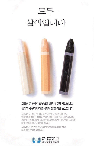 "모두 살색입니다." 2001년 대한민국 공익광고제에서 대상 수상작. "모두 살색입니다."라는 명료한 한 문장과 흰색, 검은색, 살구색 크레파스가 나란히 놓인 사진 한 컷은 대중에게 큰 울림을 주었다. 국가인권위원회는 2002년 크레파스와 물감 등에 쓰인 '살색'은 평등권 침해라며 기술표준원에 한국산업규격(KS)을 개정토록 권고했고 살색은 '살구색'으로 변했다. 포스터는 교과서에도 실렸다.