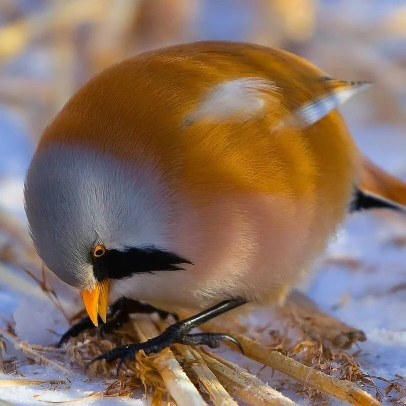 수염오목눈이(Panurus biarmicus). 참새목에 속하는 새로 영국과 남유럽, 유라시아 대륙의 중위도 지역에 서식하는 텃새다. 오목눈이란 이름답게 눈이 폭 하고 들어가 있으며, 수컷은 눈 밑에 콧수염처럼 길게 검은 띠가 있다. 갈대숲과 같은 습도가 있는 지역에 서식하며 몸길이는 16cm 정도이다.