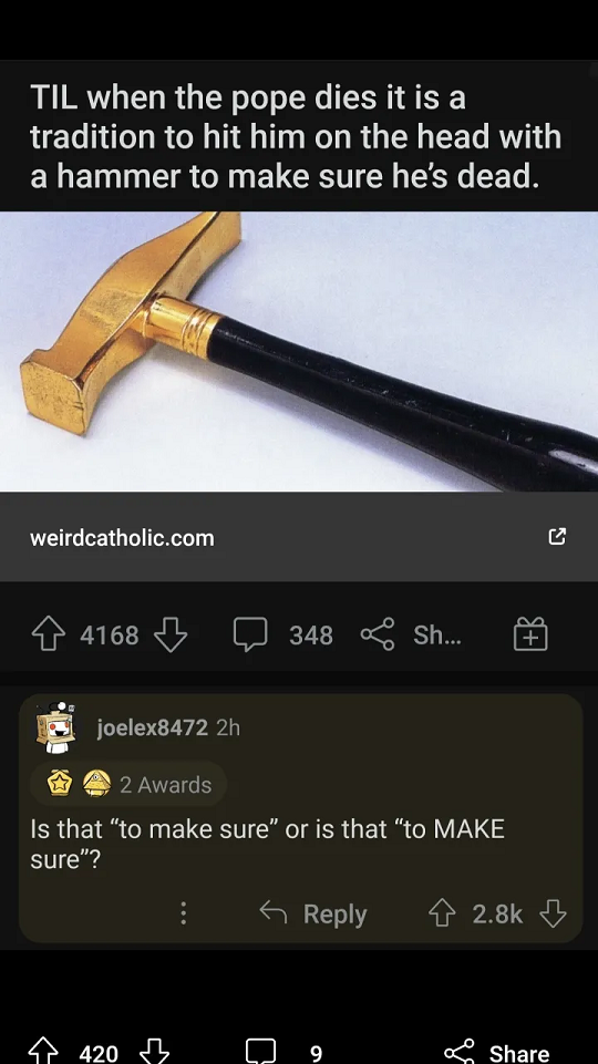 그렇다면 이러한 루머가 생기게 된 이유는 무엇일까? 실제로 19세기의 교회사를 보면 궁무처장이 교황의 시신이 있는 방의 문을 황금 망치로 세 번 두드린다는 기록이 남아 있긴 하다. 또한 교황의 죽음을 확인하는데 망치가 사용됐다고 주장하는 트윗에는 화려하게 장식된 금색 망치 사진이 포함되어 있는데, 이 망치는 포르타사타, 즉 신성한 문을 여는데 사용되는 망치로 희년의 성문을 여는 행사에서 교황이 은망치로 세 번 두드려 여는 행사에서 사용되었었다.