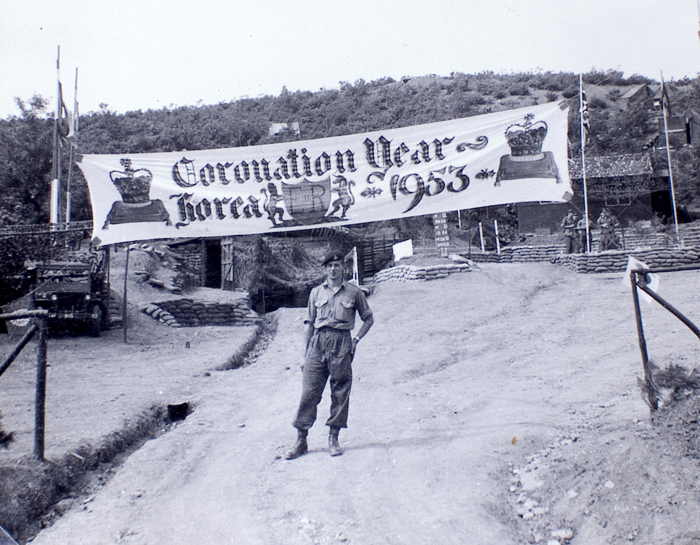 6.25에 참전한 영국군 포병연대 소속 통신병 덕 레이랜드 씨가 영국 엘리자베스 2세 여왕의 즉위를 기념해 직접 그린 현수막 앞에 서 있는 사진. 이 현수막은 2014년 영국 정부에 반환되었다. 사실 영국은 미국과는 다르게 한국과 직접적인 이해관계가 없는 나라였다. 그런데도 6.25가 발발하자마자 노동당과 보수당이 계파를 뛰어넘어 한반도 출병을 기정사실화 했고, 전쟁 발발 두 달도 채 되기 전에 영국의 첫 부대가 부산항에 도착했다. (당시 6주가 걸리는 항해 기간을 생각해 보면 엄청나게 빠른 행보였다.)