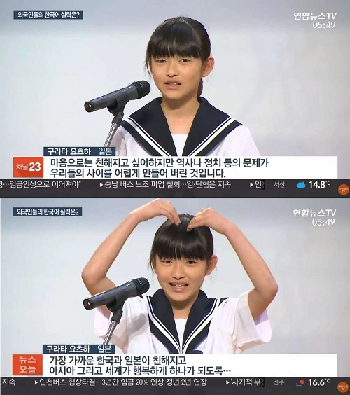 이날 본선 참가자 중 가장 어린 일본 중학생 구라타 요츠하는 경색된 한일관계를 여중생의 시선으로 감성적으로 풀어냈다. “있는 그대로의 한국을 알기 전까지 한국 사람들이 일본을 싫어하는 줄 알았다”며 지난날을 소회했다. 이후 이어진 인터뷰에서 “한국 사람에게 일본을 알리고 반대로 일본 사람들에게 한국을 알리는 일을 하고 싶다”라고 밝혔다.