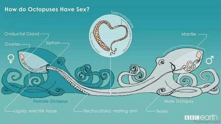 수컷 문어의 8개의 다리 중 세번째 발(일반적으로 문어의 다리를 긴 순서대로 1~8의 번호를 매기는데 이중 세번째로 긴 다리) 끝부분에 생식기가 달려 있다.