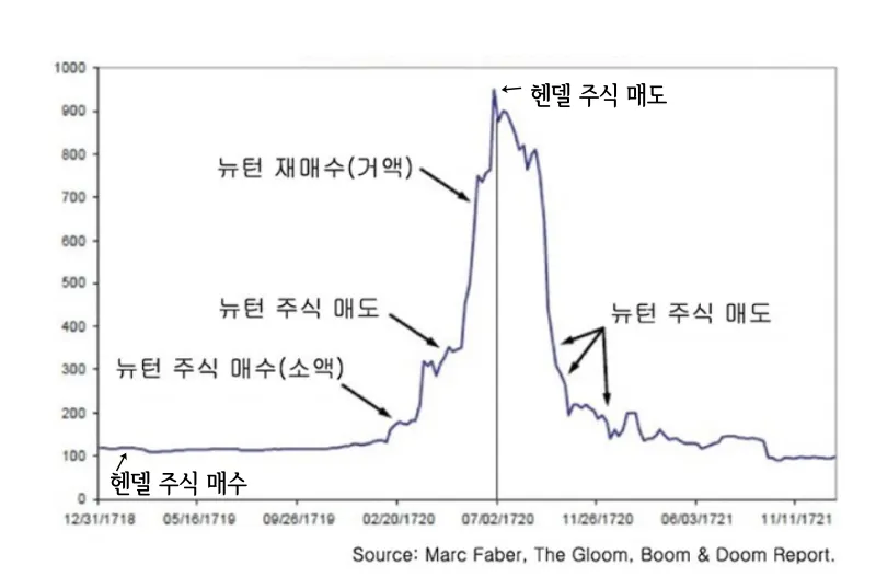 아이작 뉴턴은 처음엔 남해회사 주식으로 쏠쏠한 재미를 봤다고 한다. 그런데 계속해서 재미를 보는 친구들을 보고 참지 못하고 다시 거금을 투자했다. 하지만 뉴턴이 투자한 시점은 남해회사 거품이 꺼지기 직전의 최절정기였고, 곧바로 나락으로 떨어졌다. 당시 뉴턴이 잃은 돈은 2만 파운드였는데 자신의 모든 재산의 8~90%였다고 한다. 오늘날로 환산하면 약 346만 파운드였다. 이때 뉴턴이 남긴 "내가 천체의 움직임은 계산할 수 있어도, 인간의 광기는 도저히 계산할 수가 없다."라는 말이 유명하다.