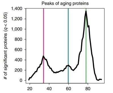 2019년 과학학술지 네이처 메디신에 미국 스탠퍼드대 연구진이 인간의 노화에 관한 논문을 올렸는데, 사람들은 성장을 멈춘 후 점차 늙어가는데 특히 34살, 60살, 78살 전후에 급격히 노화 촉진이 발생한다고 함. 연구진이 총 4,263명의 혈액에서 혈장을 분리한 뒤, 여기에서 3천여가지 혈장 단백질을 분석한 결과, 이중 1,397개의 단백질이 나이가 들어감에 따라 수치가 달라지는 걸 발견함. 그런데 '나이는 점진적으로 먹는 것이기 때문에 노화도 서서히 진행될 것이다' 라는 가정과 다르게 단백질 수치로 본 노화 그래프는 선형 곡선이 아닌 3개의 꼭지점이 있는 곡선이 나옴. 정리하자면 사람이 나이를 먹으며 늙어가면서 34살, 60살, 그리고 78살때 급격히 늙는다는 것임. 향후 이 연구를 더 진행해서 세포 수준의 생체 노화도를 정확히 측정하고 나아가 노화에 작용하는 단백질을 찾아낼 것으로 기대함.