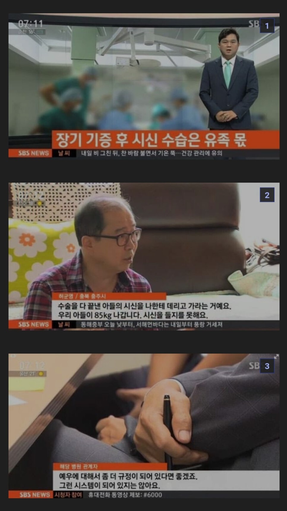 그동안 미흡했던 장기기증자 예우는 그래도 저렇게 문제제기가 된 이후 개선되긴 함. 국립장기조직혈액관리원 지침이 변경돼 기증원과의 협약 여부와 관계없이(이전에는 기증원과 협약이 되어 있어야만 지원이 되었음) 기증자와 유가족에 대한 예우를 제공할 수 있게 되었음. 또한 2018년부터는 뇌사장기기증자 이송지원 사업을 통해 장기기증 후 타 장례식장으로 이송이 필요한 경우 이송지원 서비스를 제공했음. 기증자 예우는 지원금과 가족관리 프로그램으로 나뉘는데 뇌사장기기증자나 인체조직기증자 유가족은 장제비나 진료비를 제공받거나 사회단체에 고인의 이름으로 기부할 수 있는 선택권을 가지며, 상황에 따라 장제비나 진료비 등을 최대 540만원까지 지원받을 수 있음. 장기기증자 등록을 했지만 사후 기증하지 못했더라도 360만원을 지원받을 수 있게 되었음. 간 이식의 경우 이식대상자를 지정하지 않고 이식하면 정기검진비용과 유급휴가 보상금을 지원하며 2019년부터 지원금 신청 서류도 간소화됨. 또한 유가족을 향한 상담, 복지서비스, 예우 사업도 진행하고 있음.